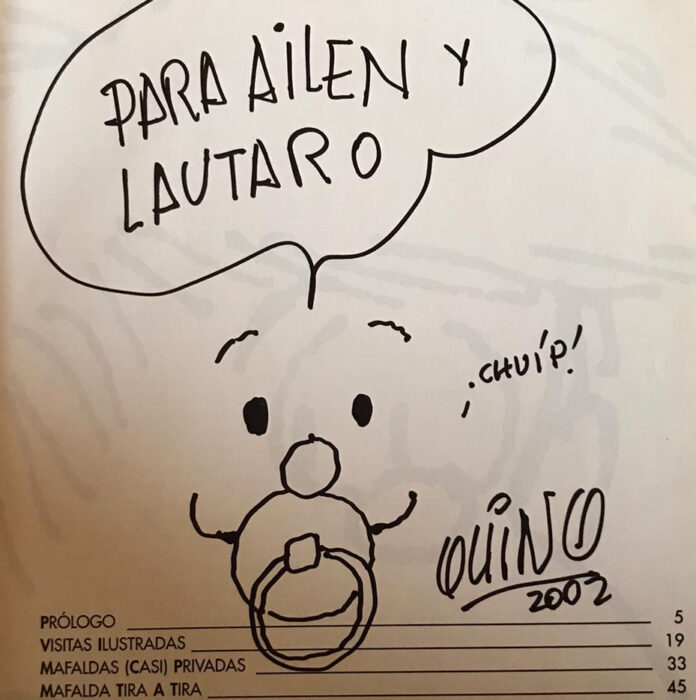 nucas, mientras torcíamos los cuellos para ver qué escribía. La segunda foto era del autógrafo que Quino nos había dedicado sobre una edición flamante de Toda Mafalda, completo con Guille, el personaje preferido de mi hermano. Sé que en alguna parte de la casa de Michigan de mis padres hay una tercera foto, donde estoy yo parada al lado de Quino, con una mezcla de felicidad e incredulidad.