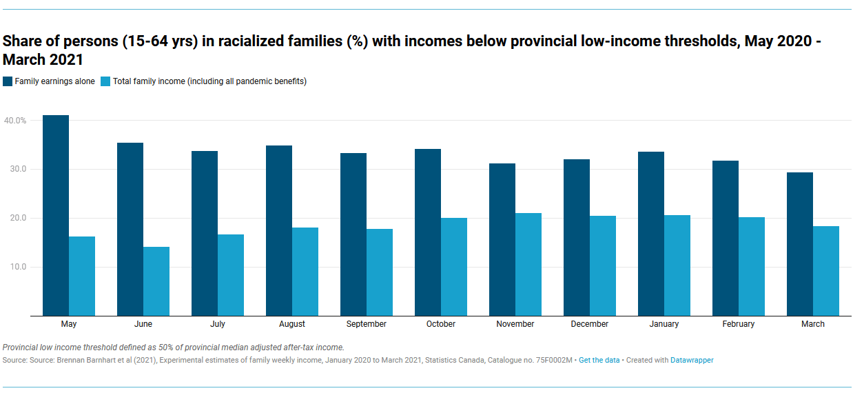 These programs were especially important for racialized and Indigenous workers. The poverty rate among racialized people, for instance, was effectively cut in half from May through August last year.