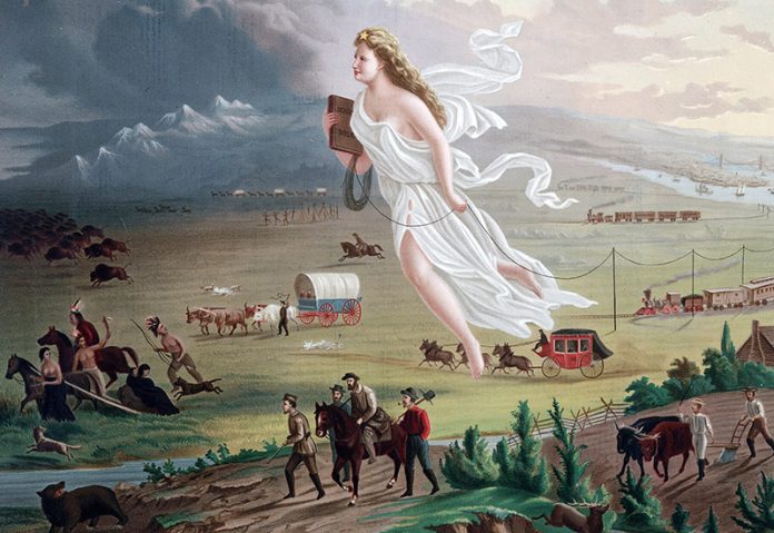En esa icónica representación del avance del progreso colonizador (y vale recordar que su autor era un inmigrante y que inmigrantes eran la mayor parte de quienes acudían en masa a ocupar el territorio «liberado») Columbia, la representación femenina de los EEUU, avanza desde el este, llevando la luz de la civilización y los cables del telégrafo hacia un mundo en el que todo lo destinado a desaparecer se hunde en las tineblas.